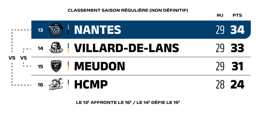 Occupant l’une des quatre dernières places du classement de la saison régulière de Division 1, les Corsaires de Nantes entameront la phase de maintien dès la fin du championnat. L’enjeu de ces playdowns est clair : éviter la dernière place, synonyme de relégation dans l’échelon inférieur.